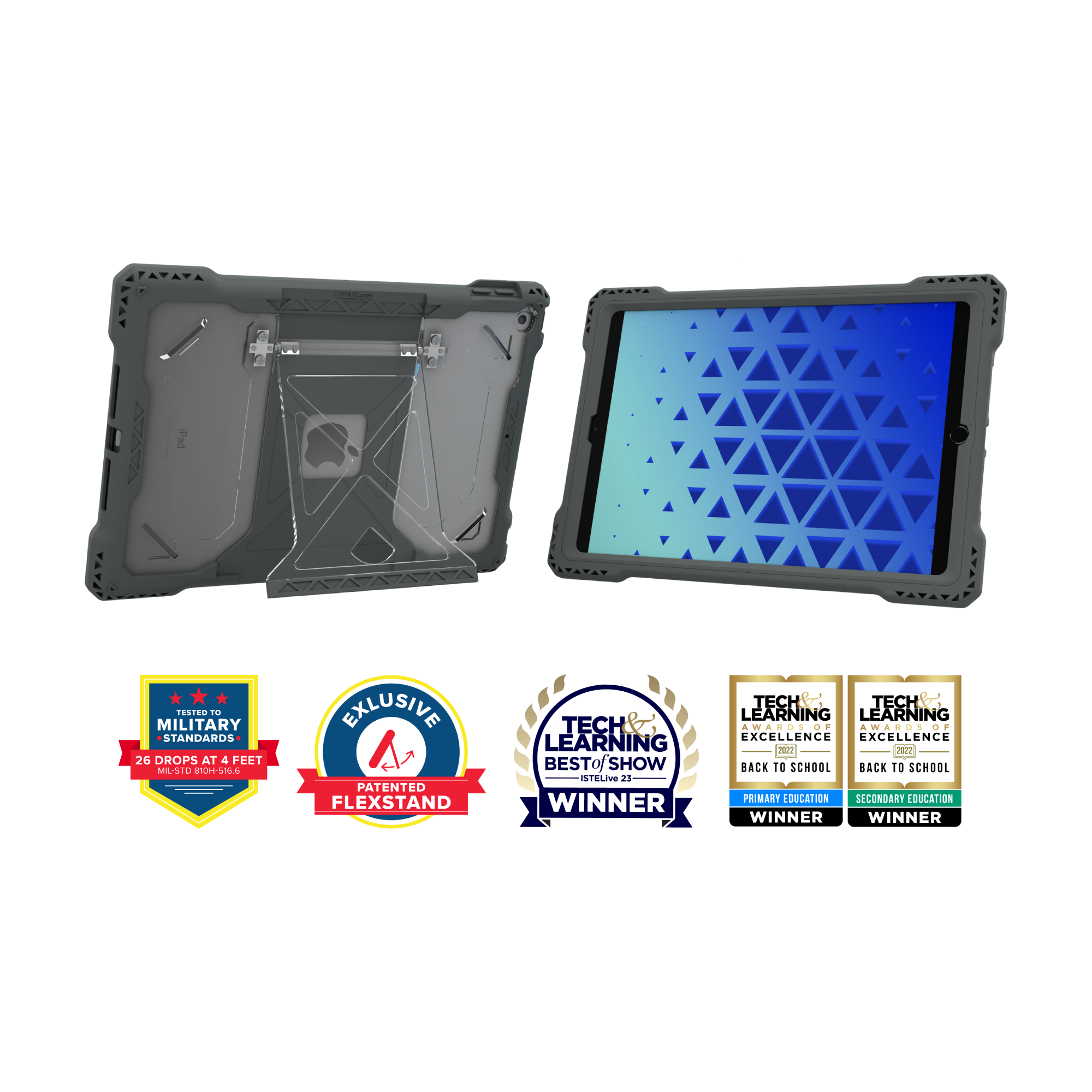 Exponentially more protective and with more functional features than its predecessors, the Shield Extreme-X2 provides a perfect fit for the iPad 9 and other 10.2” iPads. The new design features dual layers of tough TPU for outstanding impact and drop protection: a cushioning inner layer of TPU with an oil- and dirt-resistant outer layer. The removable screen protector enables easy replacement and reinsertion as needed. The virtually break-proof FlexStand kickstand provides unlimited, stable positioning options thanks to the easy-sliding friction hinge. The custom-fit design delivers easy access to all ports, openings, and buttons. Durable, updated corner anchors make it easy to add an (optional) hand strap, shoulder strap or any clip-on accessory.